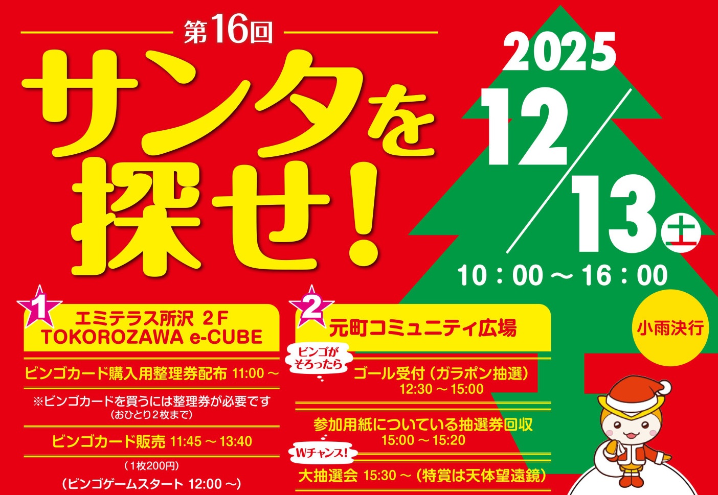 2025年12月13日、所沢の冬の恒例イベント「第16回サンタを探せ!」が開催されます。 街なかにサンタが溢れる楽しい1日! 今年も大勢のサンタクロースが町に繰...