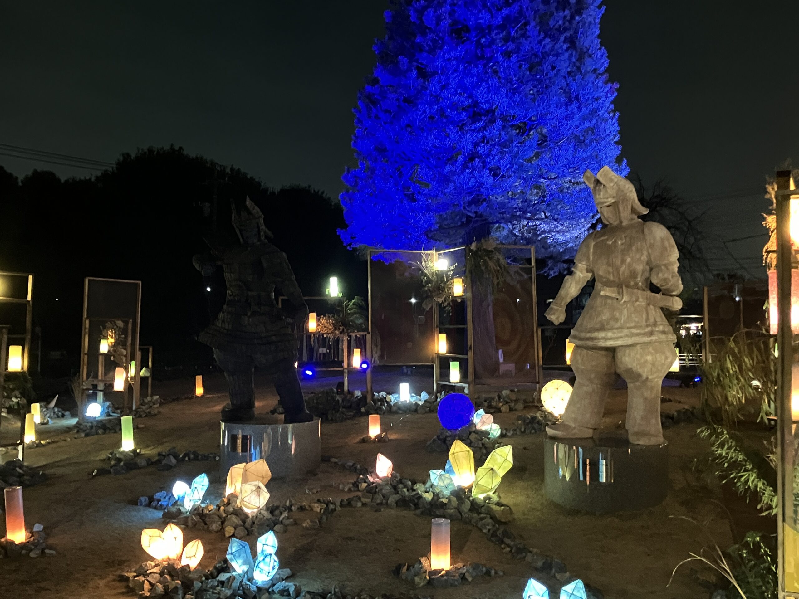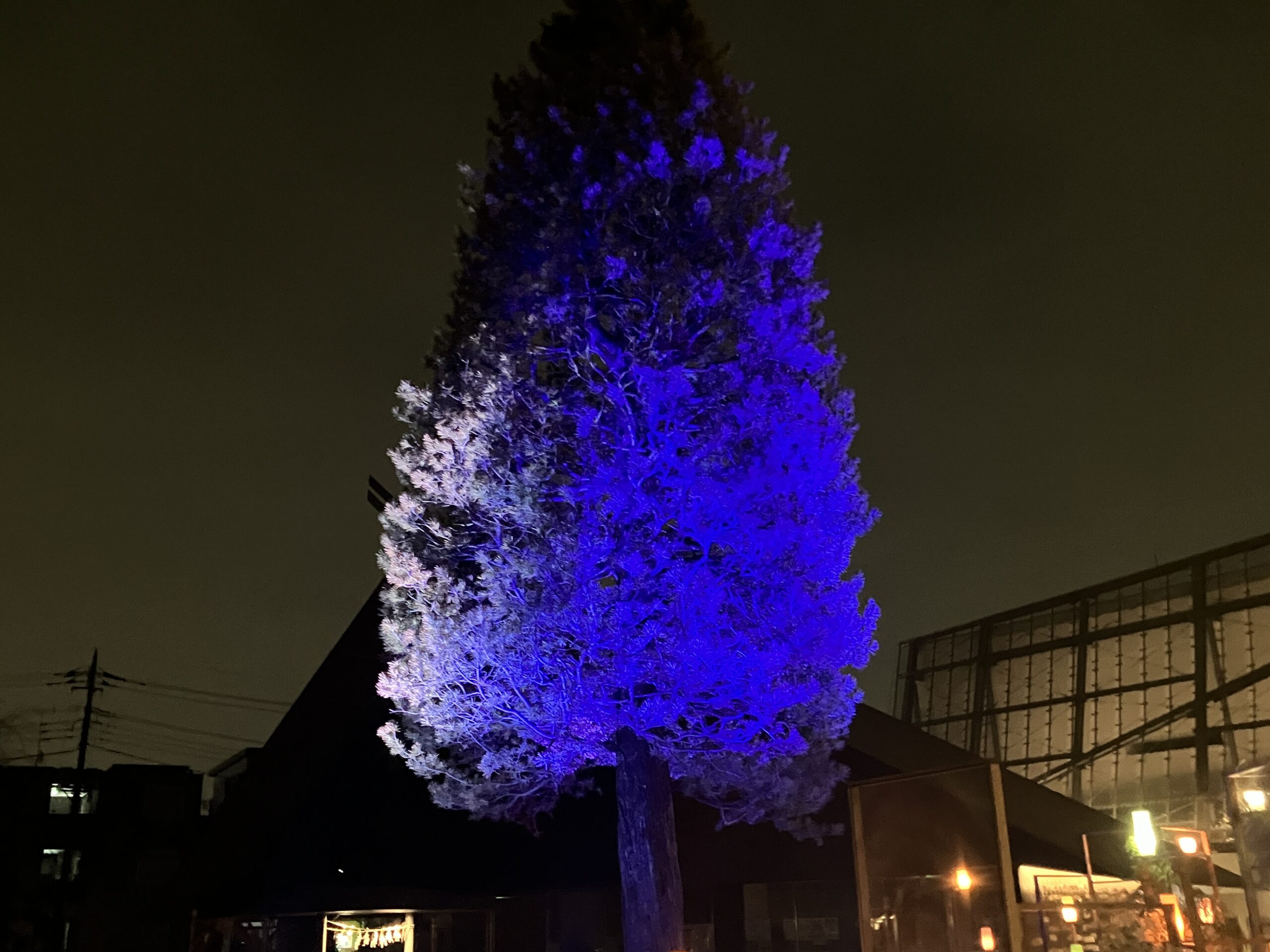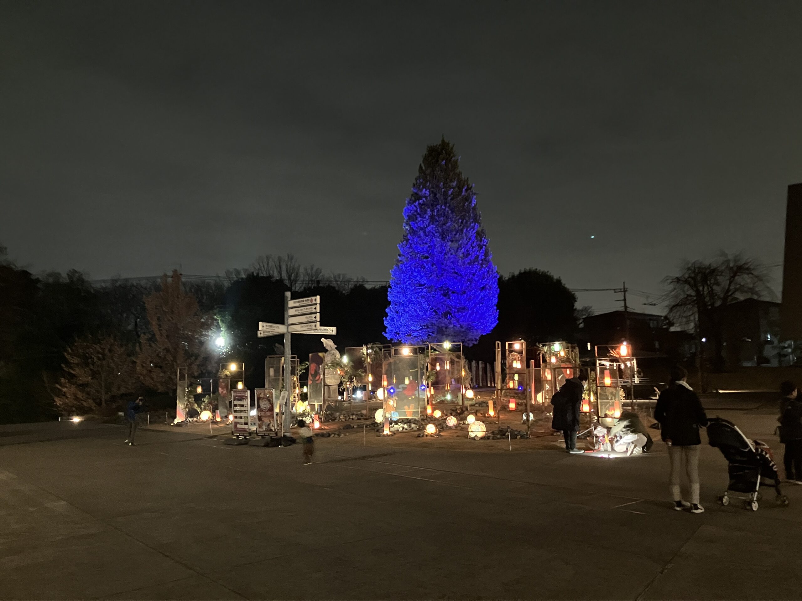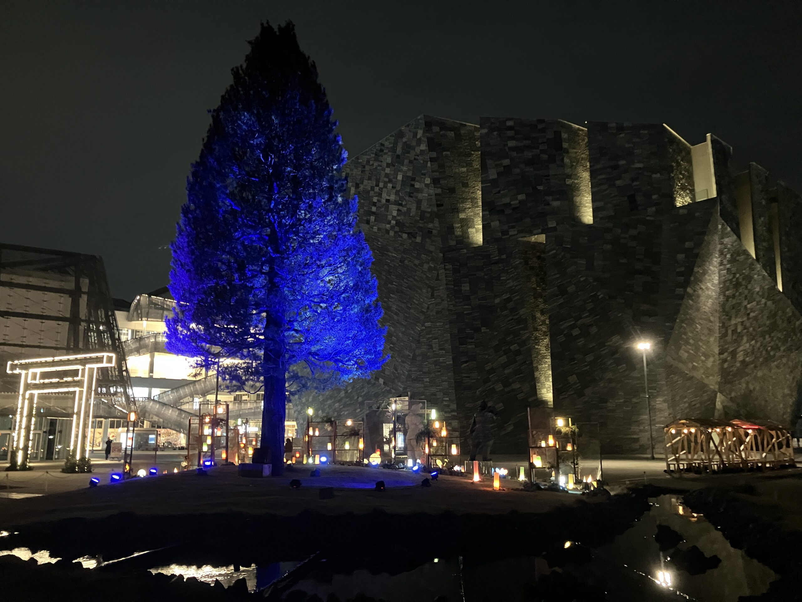 会場を包む光は、強い輝きで主張するものではなく、全体的に落ち着いたトーンで統一されています。中央広場には大きな木が一本立っており、その木が穏やかな青色のライトで照らされているのが印象的でした。