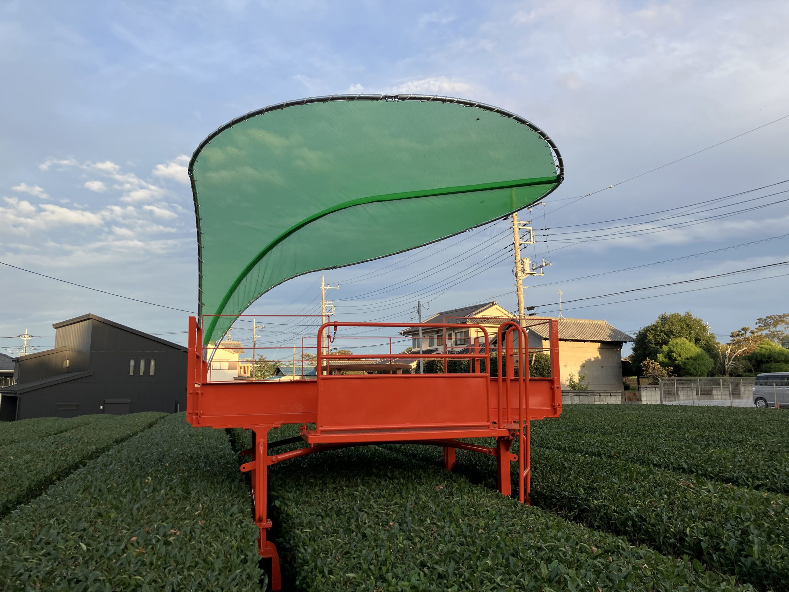 和田園には、関田重太郎さんと浅野ひかりさんによる合作「茶畑のちゃぶ台」が展示されています。乗用茶刈機と和室を組み合わせたユニークな立体作品で、茶畑の上を滑るように動く茶刈機を“床”に見立てた発想から、畑の真ん中に畳の空間をつくるというアイデアが生まれたそうです。