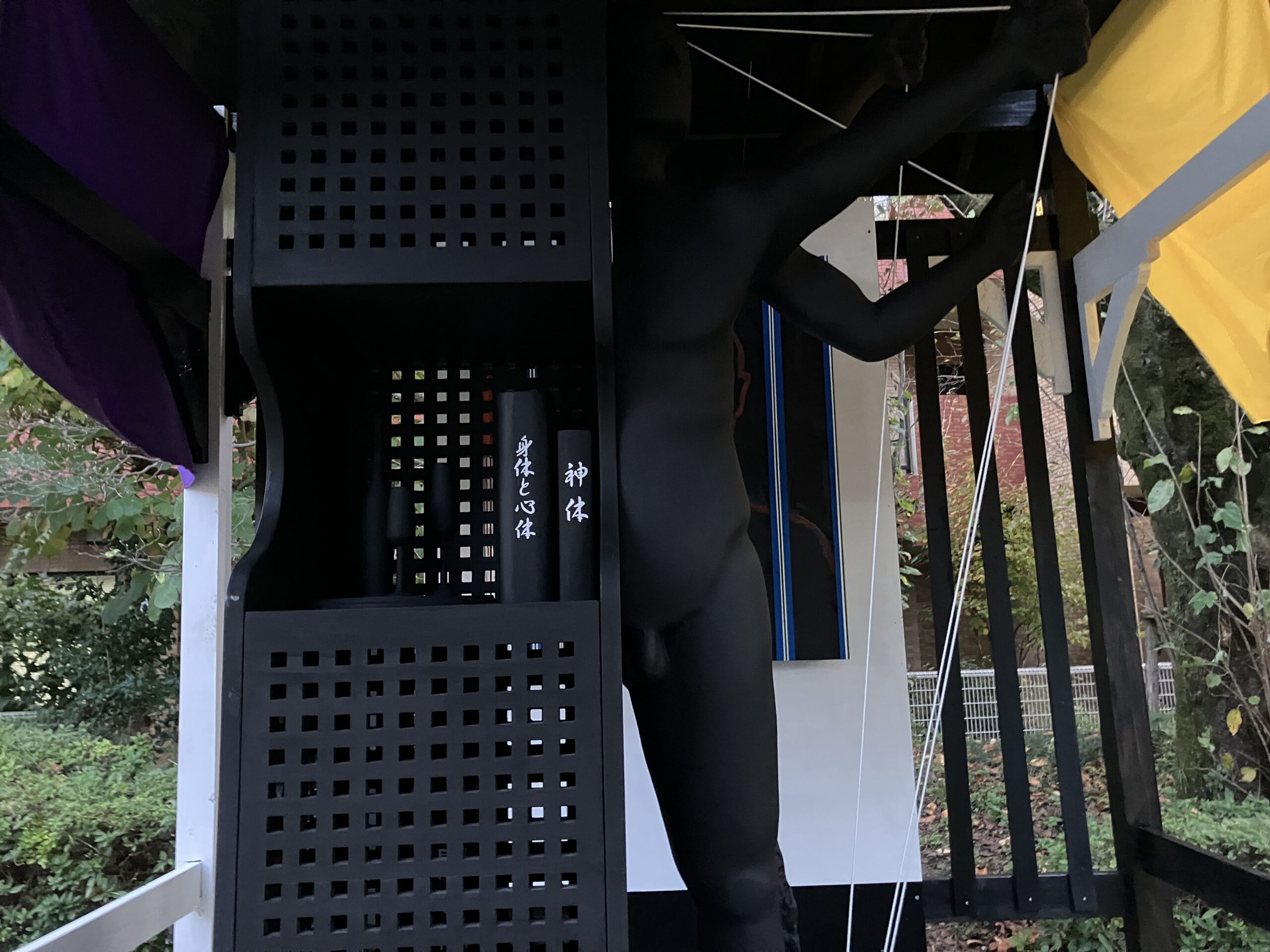 そこで出会ったのが、ひときわ存在感を放つ「BODY SCALE」。武蔵野一帯に点在するお堂のイメージをもとに制作された作品で、半身像である理由や、糸を用いている意図など、思わず背景が気になる表現が随所に見られました。
