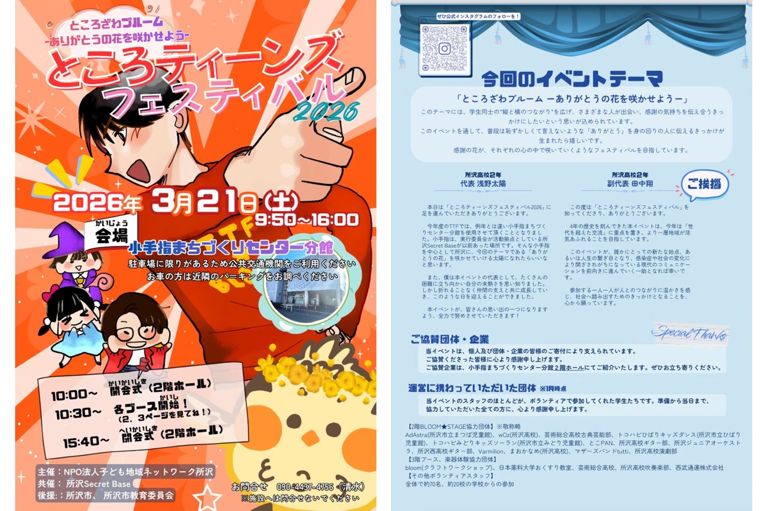 若者たちの想いをのせた「ところティーンズフェスティバル2026」が『ありがとうの花を咲かせよう』のテーマのもと3/21に小手指まちづくりセンター分館にて開催されました。