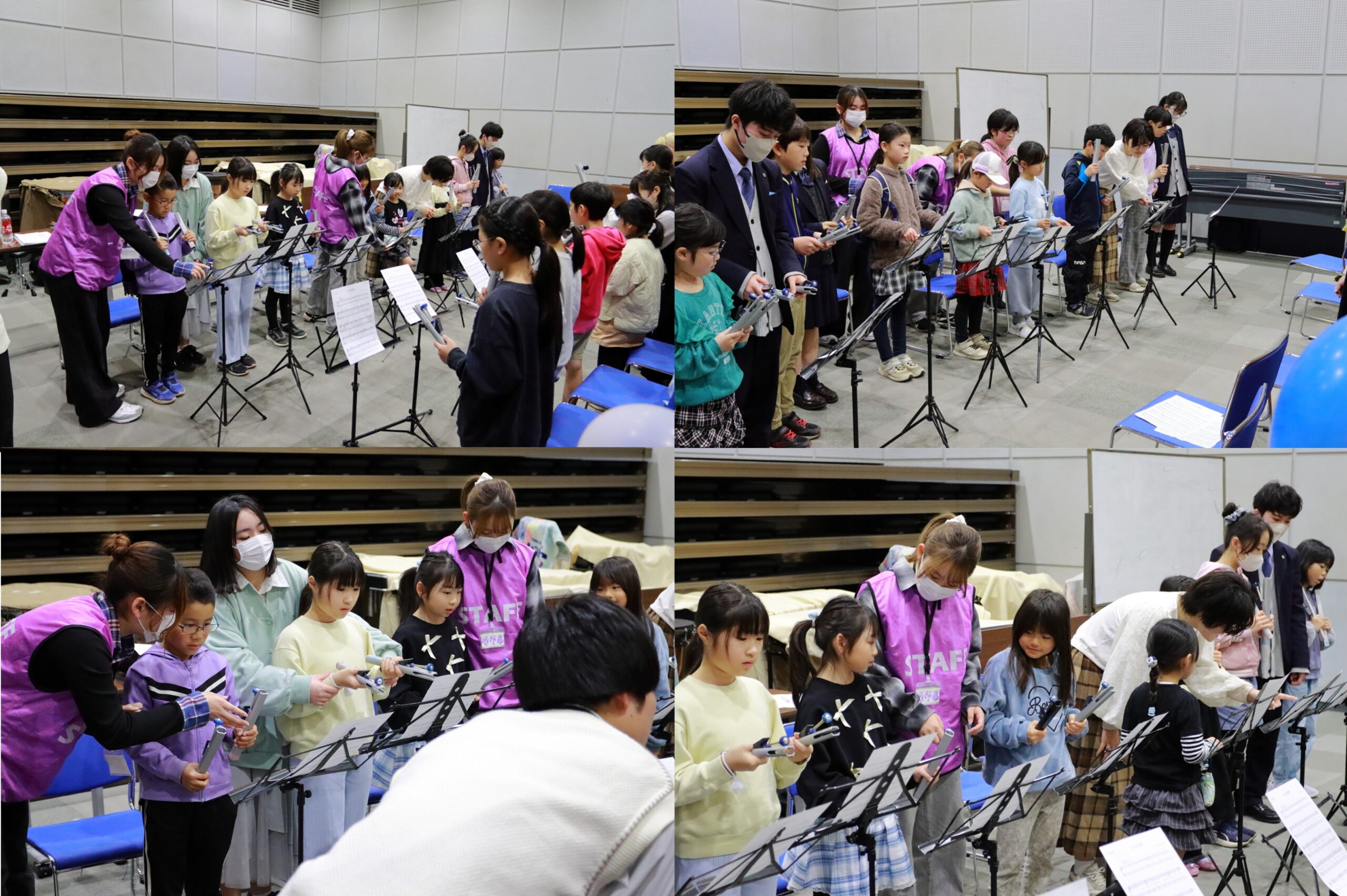 音楽ホールの一部ではトーンチャイム体験が行われていました。学生たちがマンツーマンに近いかたちで丁寧に子どもたちに教えていました。子どもたちが自分の役割をしっかり果たし、澄んだ綺麗な音が響いていました。練習後にはホールでたくさんの人の前で演奏を行ったそうです。