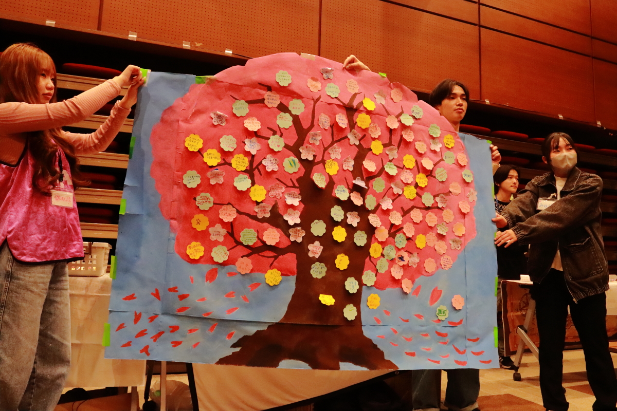 会場内の学生たちがホールに続々と集まってきました。代表のあいさつに続いて最後に「ありがとうの花」の合唱が行われました。実行委員もボランティアで活躍したスタッフも参加者のみなさんも心をあわせて『ありがとう』にあふれた曲を歌い、感動的なフィナーレを迎えました。