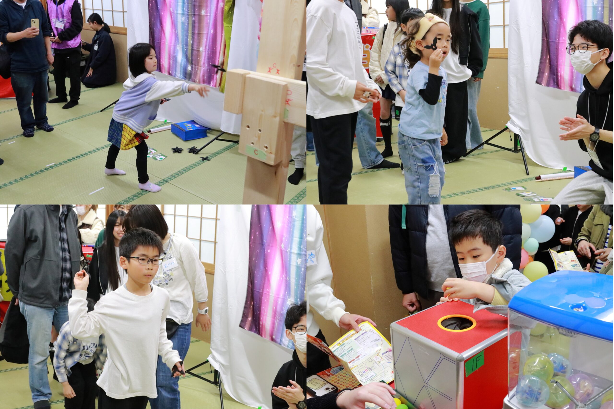 的あてコーナーでは手裏剣を的に向かって投げます。学生たちが指導してくれますが、なかなか難しいようで思ったところに投げられない子どもたちも見受けられました。でもみんな忍者になった気分でがんばって投げていましたよ。