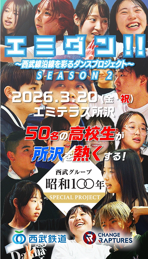 2026年3月20日(金・祝)に、「『エミダン!!~西武線沿線を彩るダンスプロジェクト~』season2」の沿線高校生有志によるお披露目イベントがエミテラス所沢2階「TOKOROZAWA e-CUBE」にて開催されます。