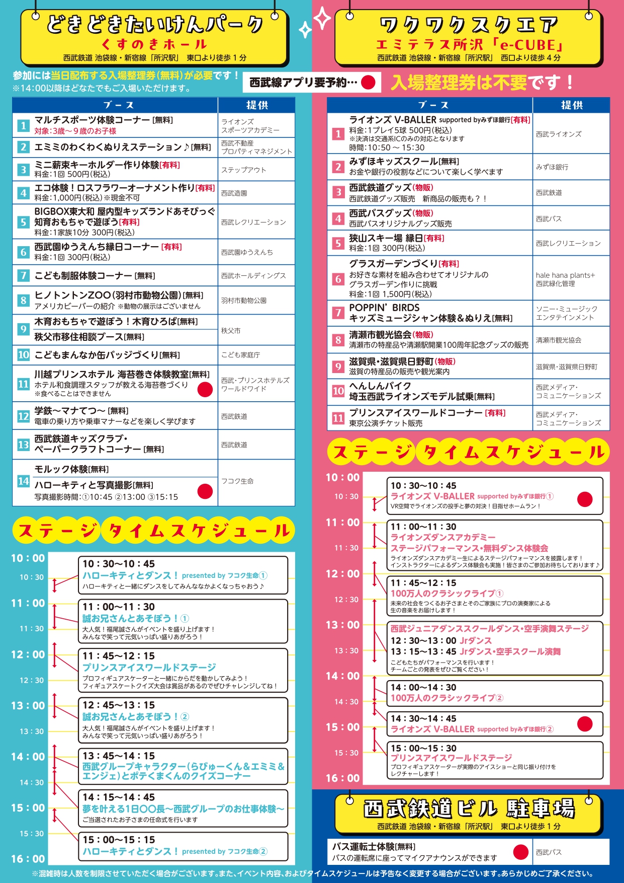 ■主な内容:西武グループ各社および本イベント趣旨に賛同いただいた自治体、企業、団体による体験・学びに関するブース出展、ワークショップ、物販、ステージイベントなど