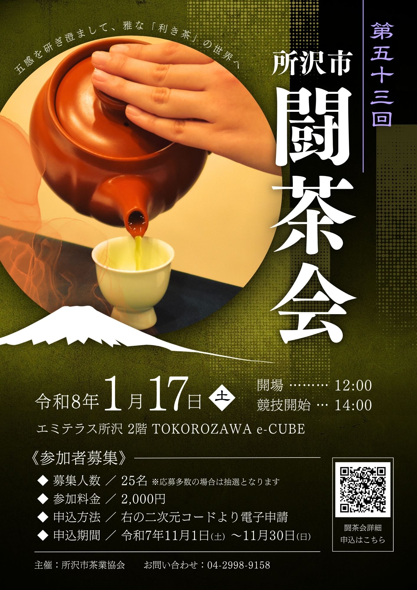 お茶のまち・所沢で毎年開催される「所沢市闘茶会」が、2026年1月17日(土)に開催されます。