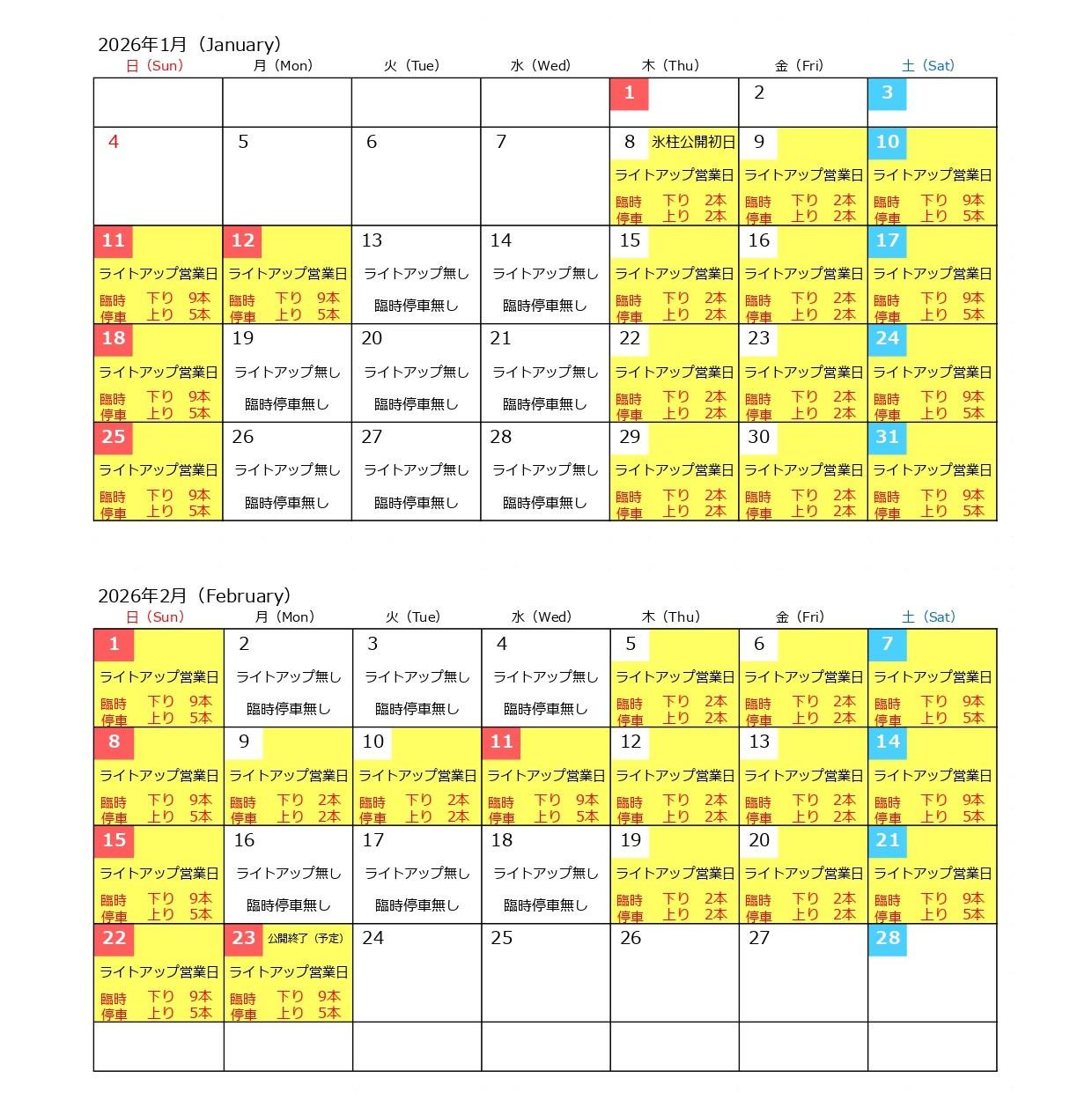 1.運転日:2026年1月8日(木)~2月23日(月・祝)の氷柱ライトアップ営業日