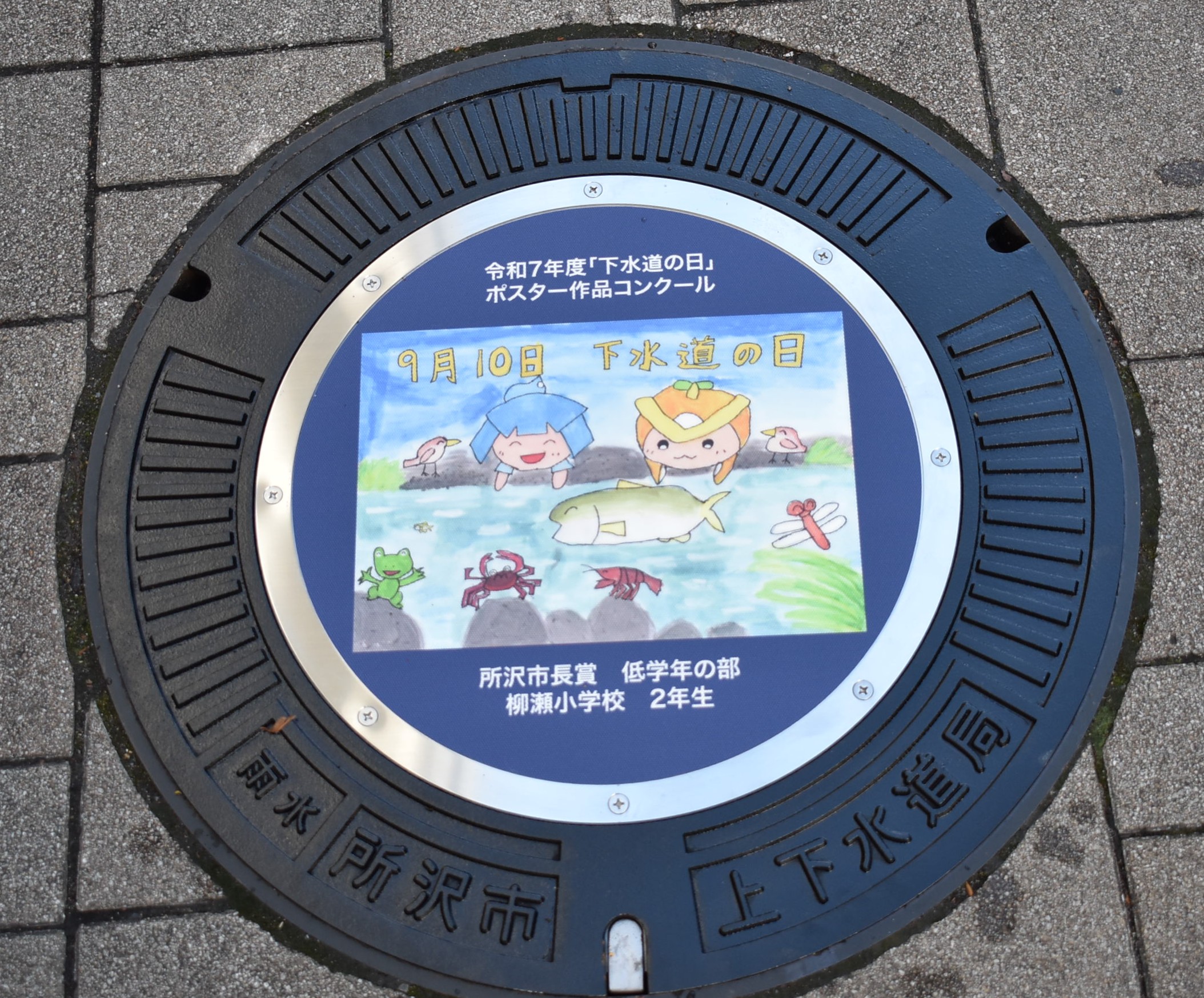 低学年・高学年の部において、所沢市長賞を受賞した作品がデザインされた下水道マンホール蓋が、標記表彰式にてお披露目された後、所沢駅東口駅前ロータリー内の歩道に設置されました。