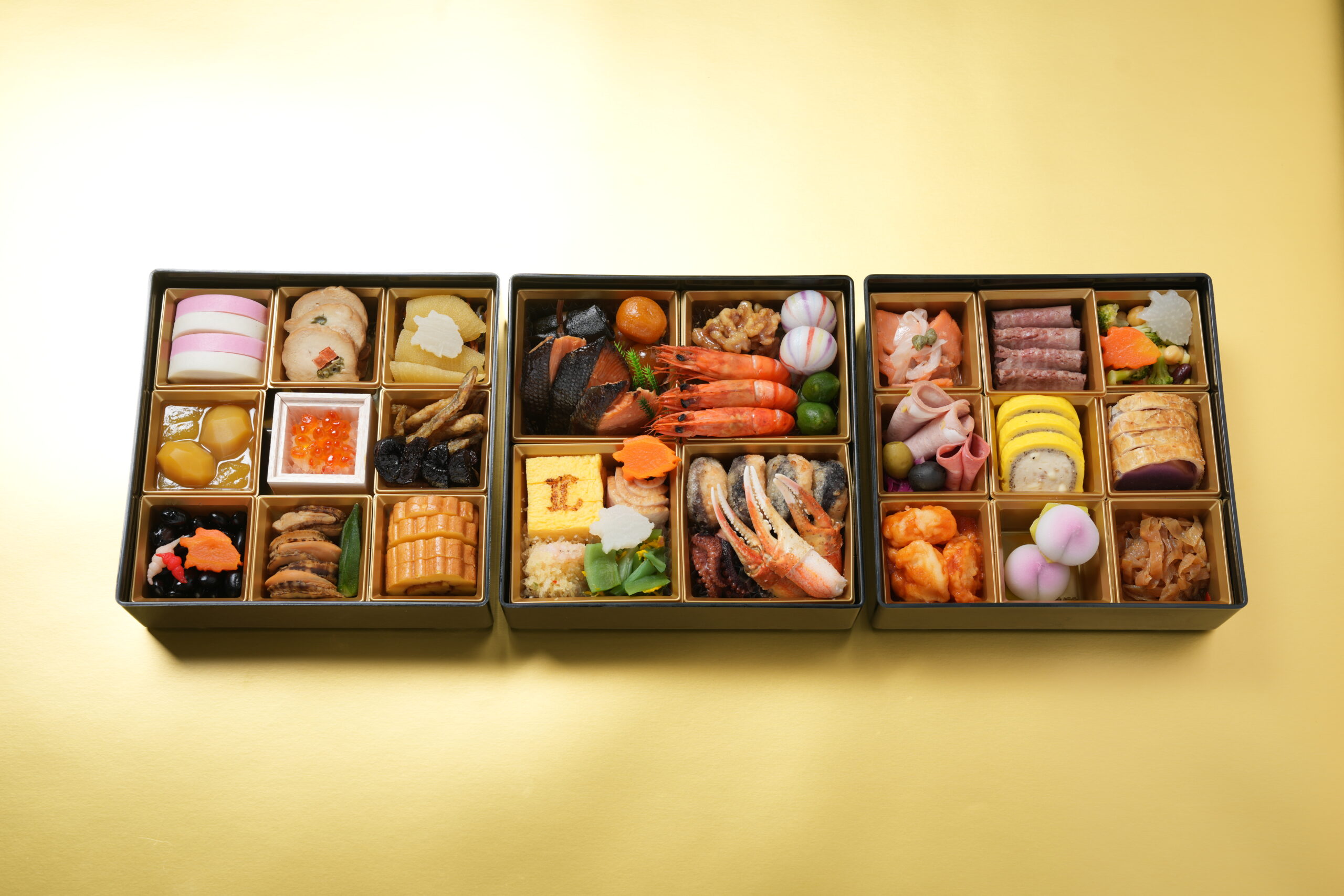 紅白蒲鉾、若鶏二色巻、数の子、松前漬け、ライオンズ型大根、栗金団、いくら醤油漬け、京風なます、わかさぎ田作り、プルーン、黒豆、千代呂木、帆立煮、割烹おくら、ライオンズ型人参、伊達巻