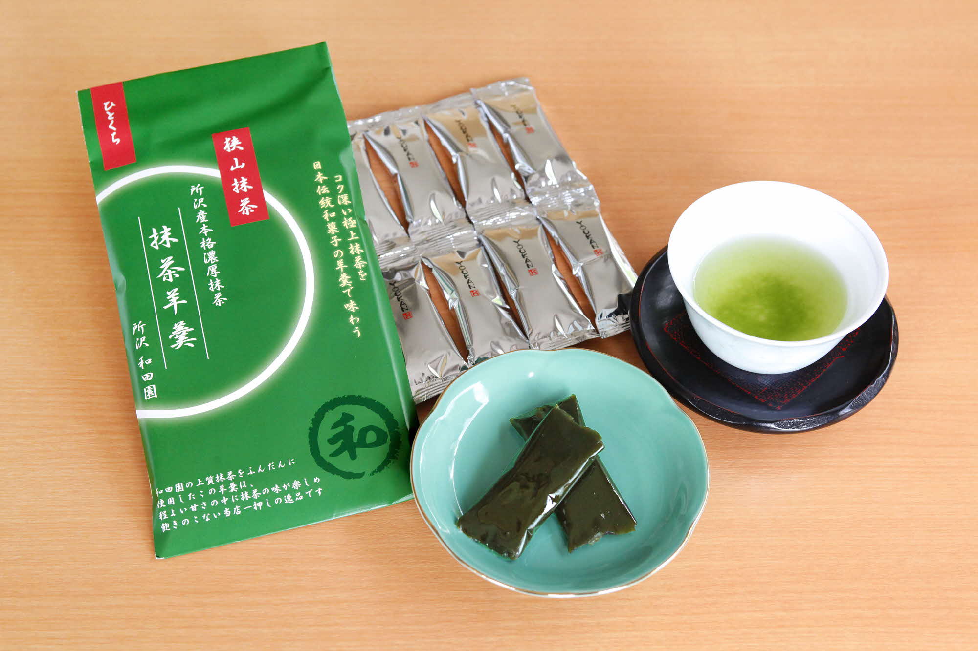 地域の魅力を伝える“所沢ならではの逸品”として誕生した「抹茶羊羹」は、自社茶園で丹精込めて育てられた狭山抹茶をふんだんに使用した贅沢な一品です。