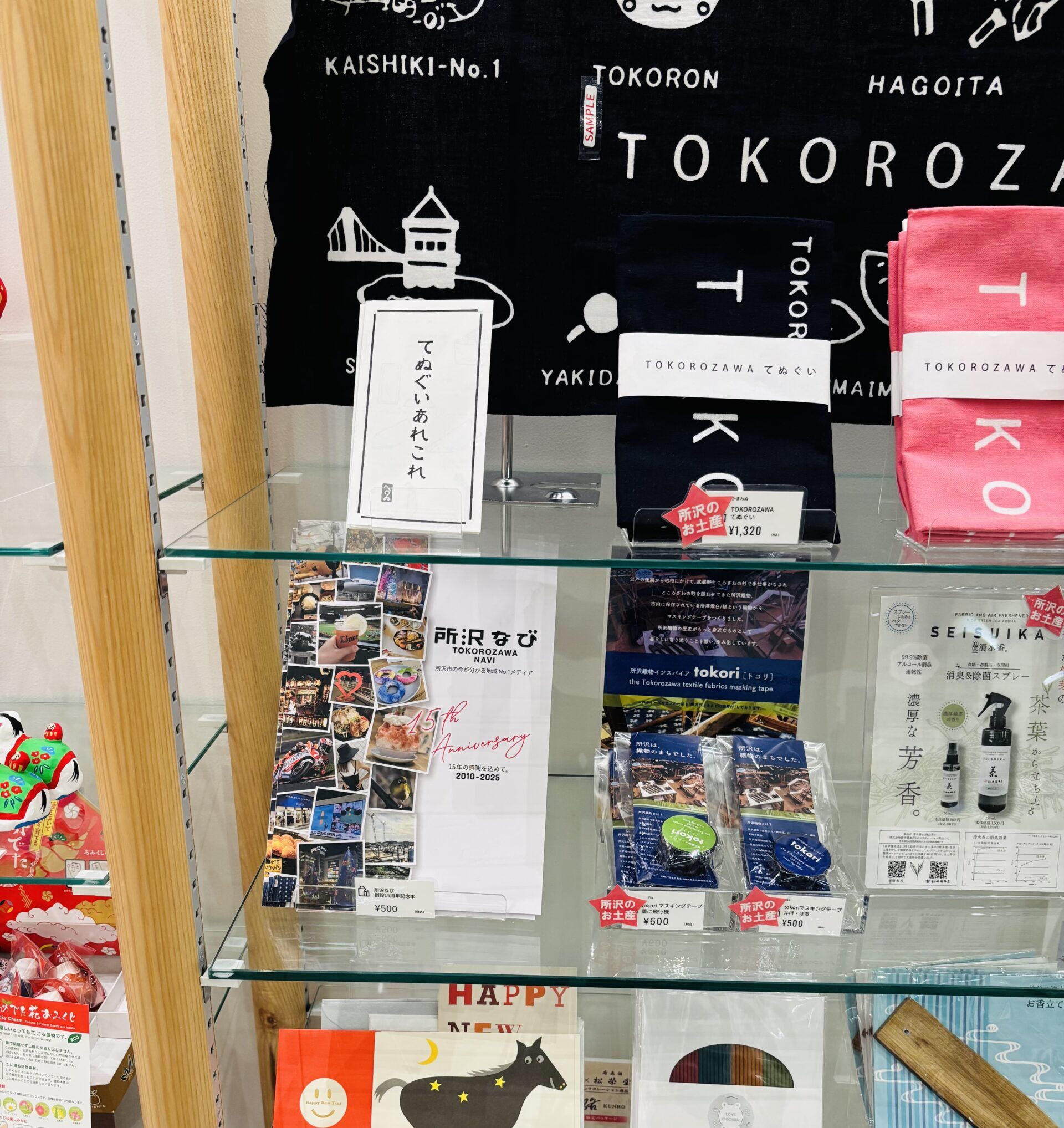 「所沢なび」創設15周年記念本と同じ棚の並びには、埼玉や所沢にゆかりのある本やグッズも並んでいます。