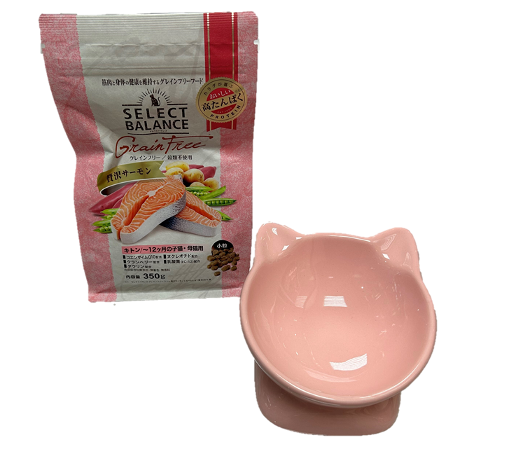 贅沢サーモンキャットフードは、0~12カ月・母猫用の小粒なフード。良質なたんぱく質で健康維持をサポートします。ネコ型のフードボウルは高さがあってネコちゃんが食べやすいデザインです。