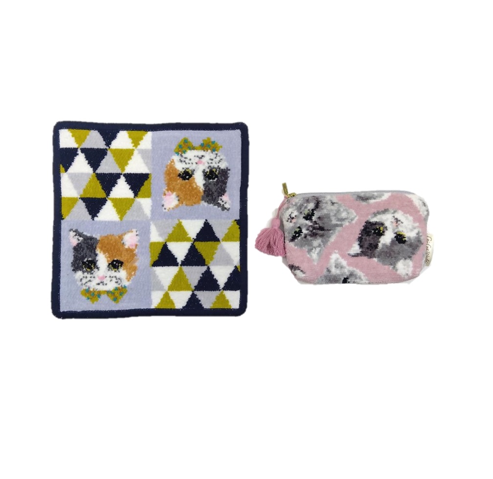 様々な表情をしたネコが散りばめらた舟形のシェニールポーチと猫の表情が心くすぐるミニサイズのシェニール織ハンカチ。毎日持ち歩きたくなるアイテムです。