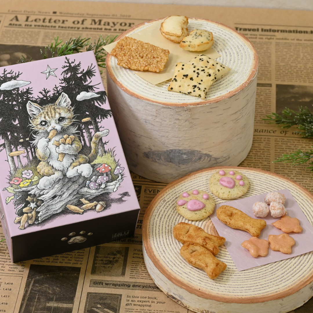 香ばしいおかきに引き寄せらせた、まるで絵本の世界のような可愛いこねこのお箱に、お魚をかたどった煎餅や、かつお節味のあられなど、猫ちゃんの好物にちなんだ味を詰合せました。