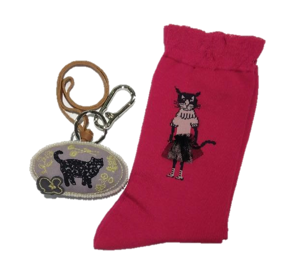 銅版画家保坂優子さんのイラストが描かれたソックスは、猫のスカート部分にレースが付いた可愛らしいデザイン。その他猫モチーフのキーチェーンなど猫グッズを取り揃えています。