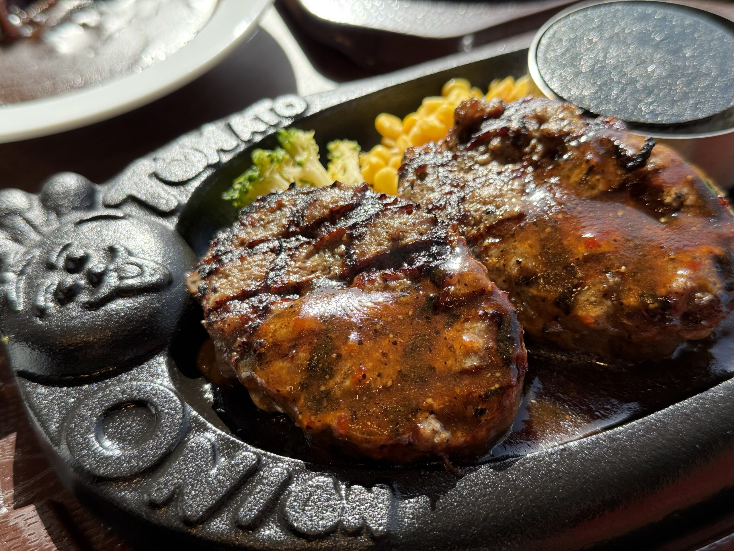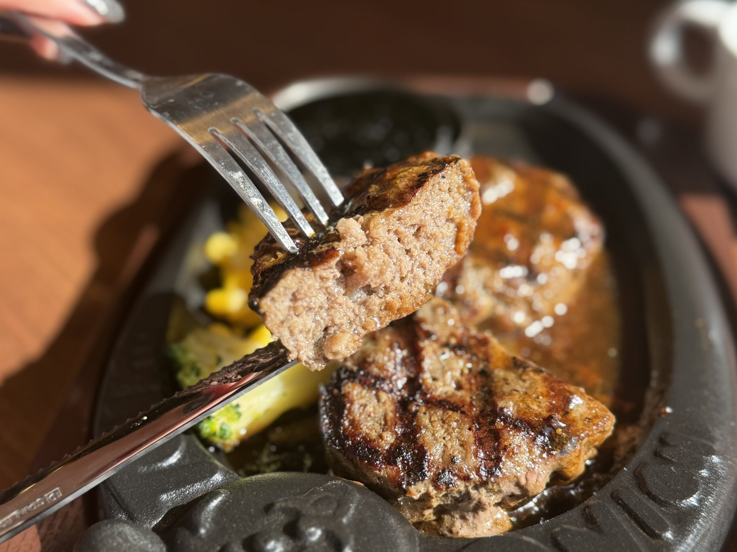 ステーキや焼肉に使用する部位が使用されています。また、ステーキやハンバーグは最後まで美味しく召し上がっていただくため、アツアツの鉄板で提供するというスタイルです。素材の旨味を最大限に引き出すためにつなぎは不使用。牛肉の素材の旨味をドーン!と感じられる、“牛肉100%!!”の肉々しい、お肉がギッシリと詰まった贅沢なハンバーグです。