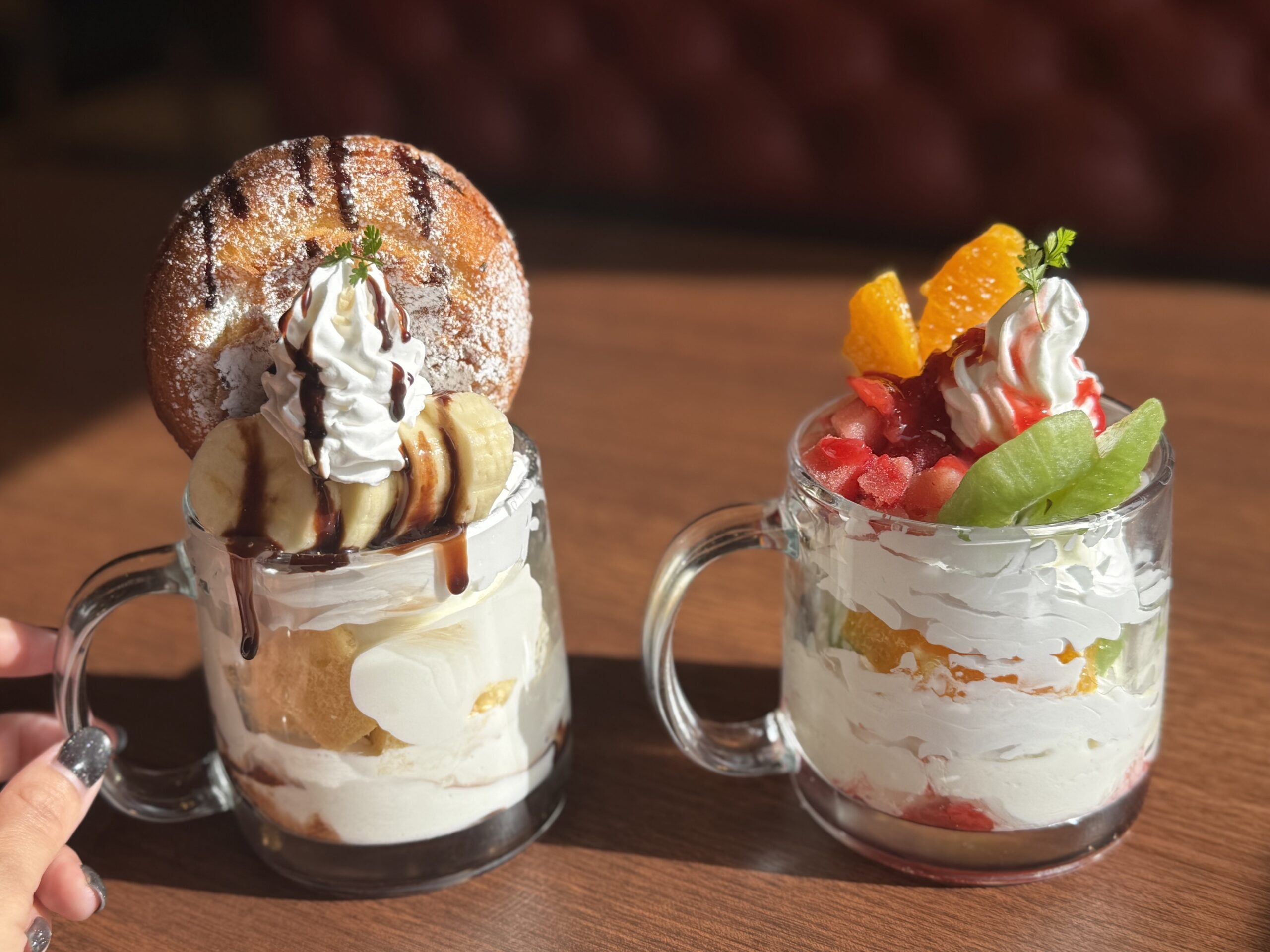 ということで、食後に、見た目もかわいい「アメリカンカップスイーツ」を注文してみました。どうでしょう、この可愛らしさ。透明なマグカップに、ドリンクではなく、スイーツ満載。他ではなかなか見かけないキュートなオリジナルデザートに、思わず写真を撮りたくなりませんか♪