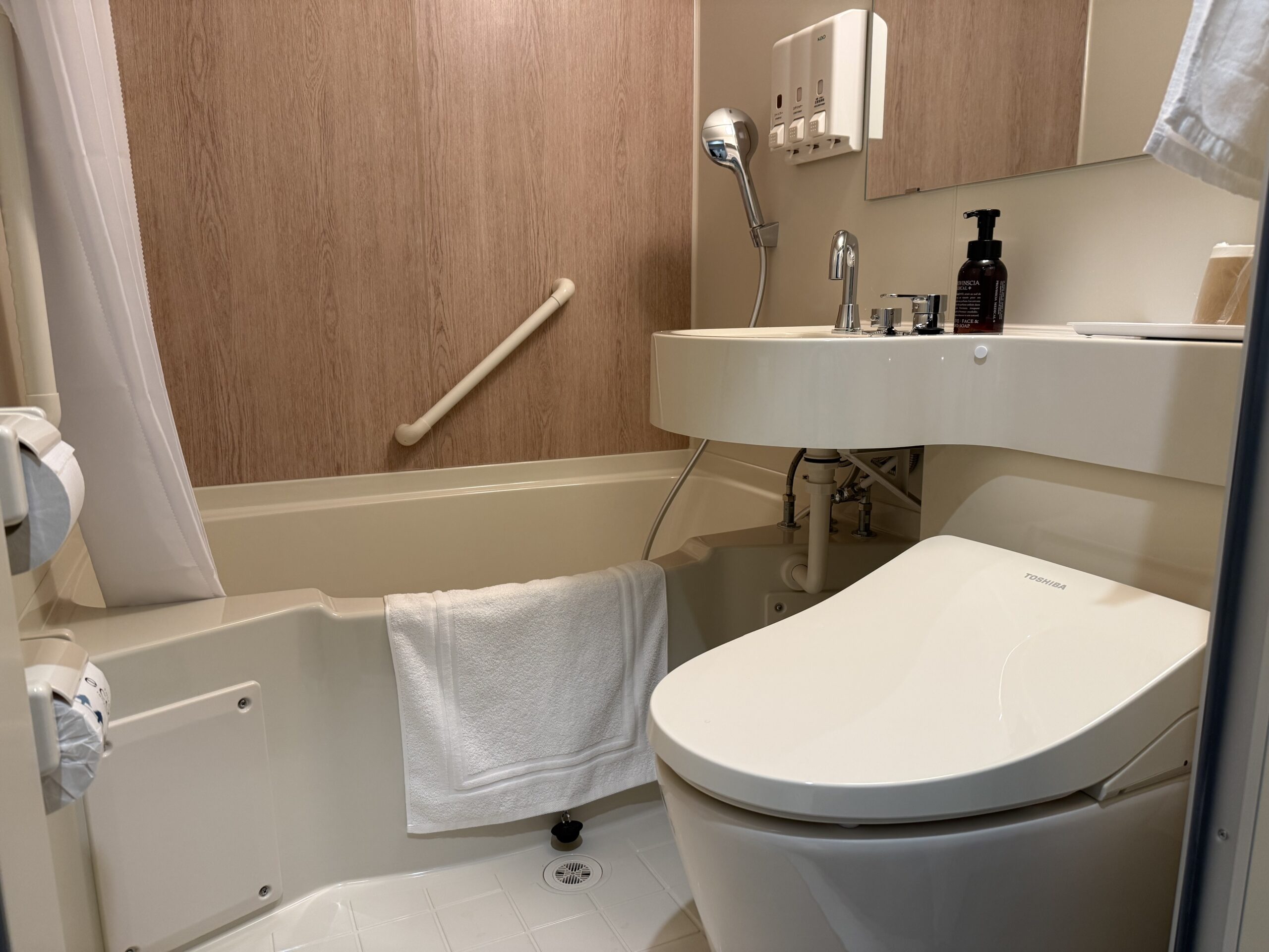 ユニットバスには、アクセントクロスに木目調の壁紙が用いられ、木の温もりを感じる優しい雰囲気に。シャンプーやコンディショナー、ボディーソープはバスルームの壁に備え付けタイプ。もちろん、バスタオルや歯ブラシもあります。