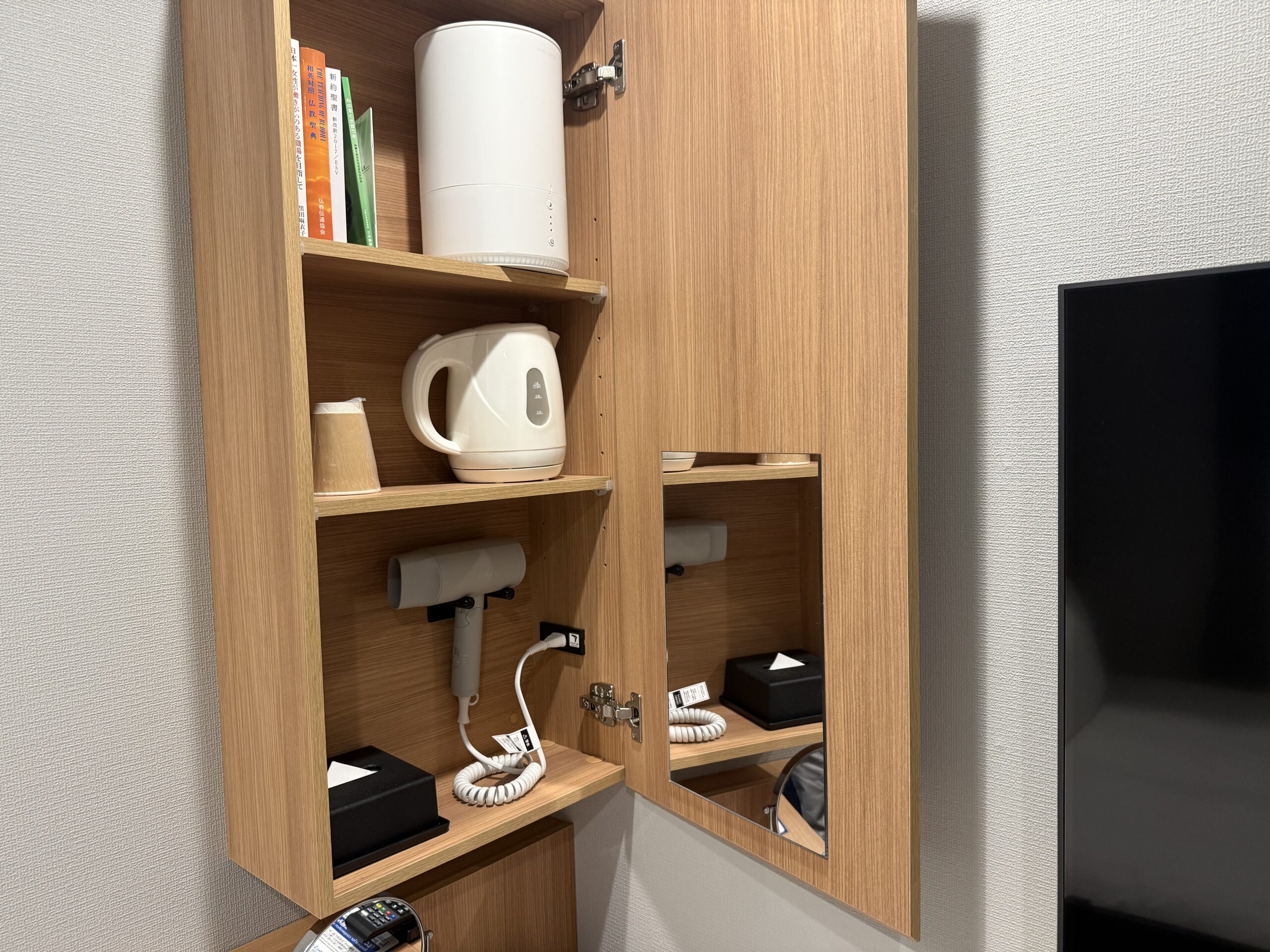 また、このほか、室内設備には冷蔵庫、客室スリッパもあります。そして、ドライヤーや電気ケトル、加湿器などは壁付けの家具の中にありました。
