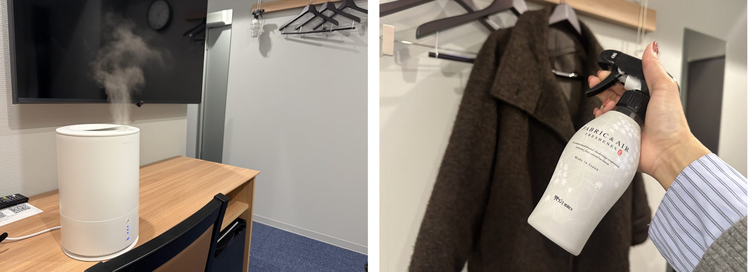 ▲写真(左)早速、加湿器も使用してみました。乾燥する冬時期にありがたい♪/(右)衣類用の除菌スプレーもありますよ