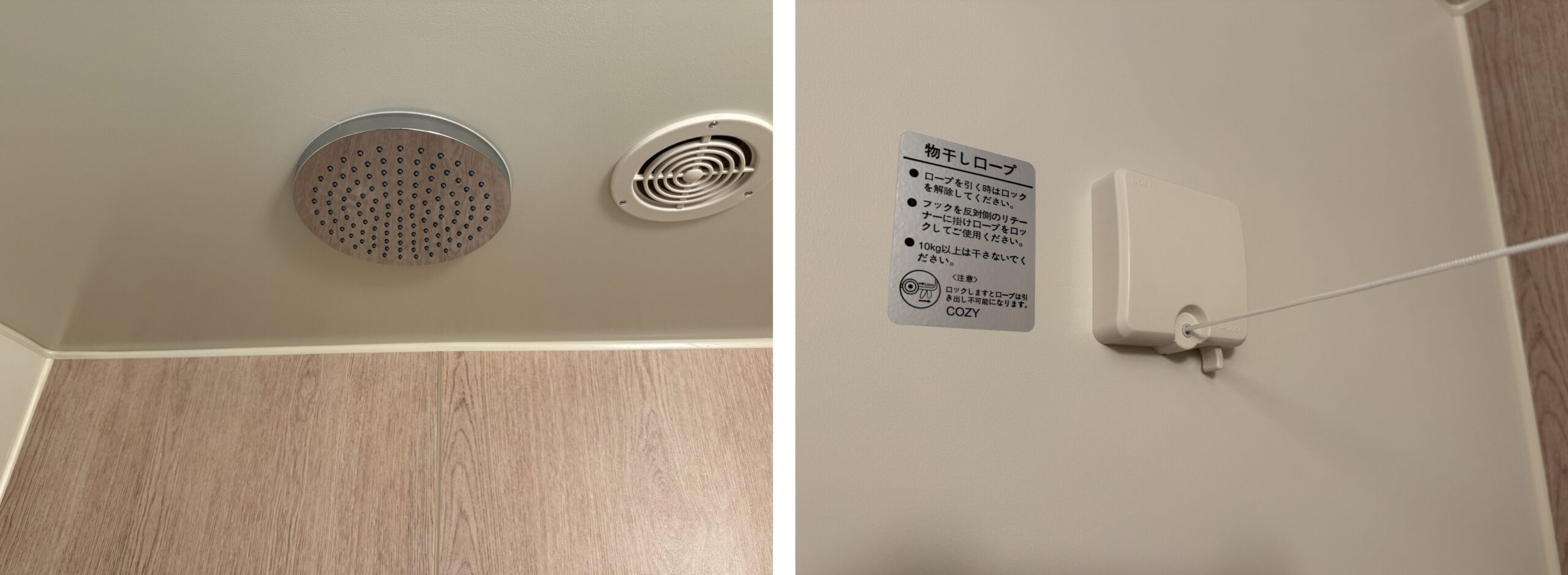 バスタブの天井にはレインシャワーがあったり、物干しロープも付いています。