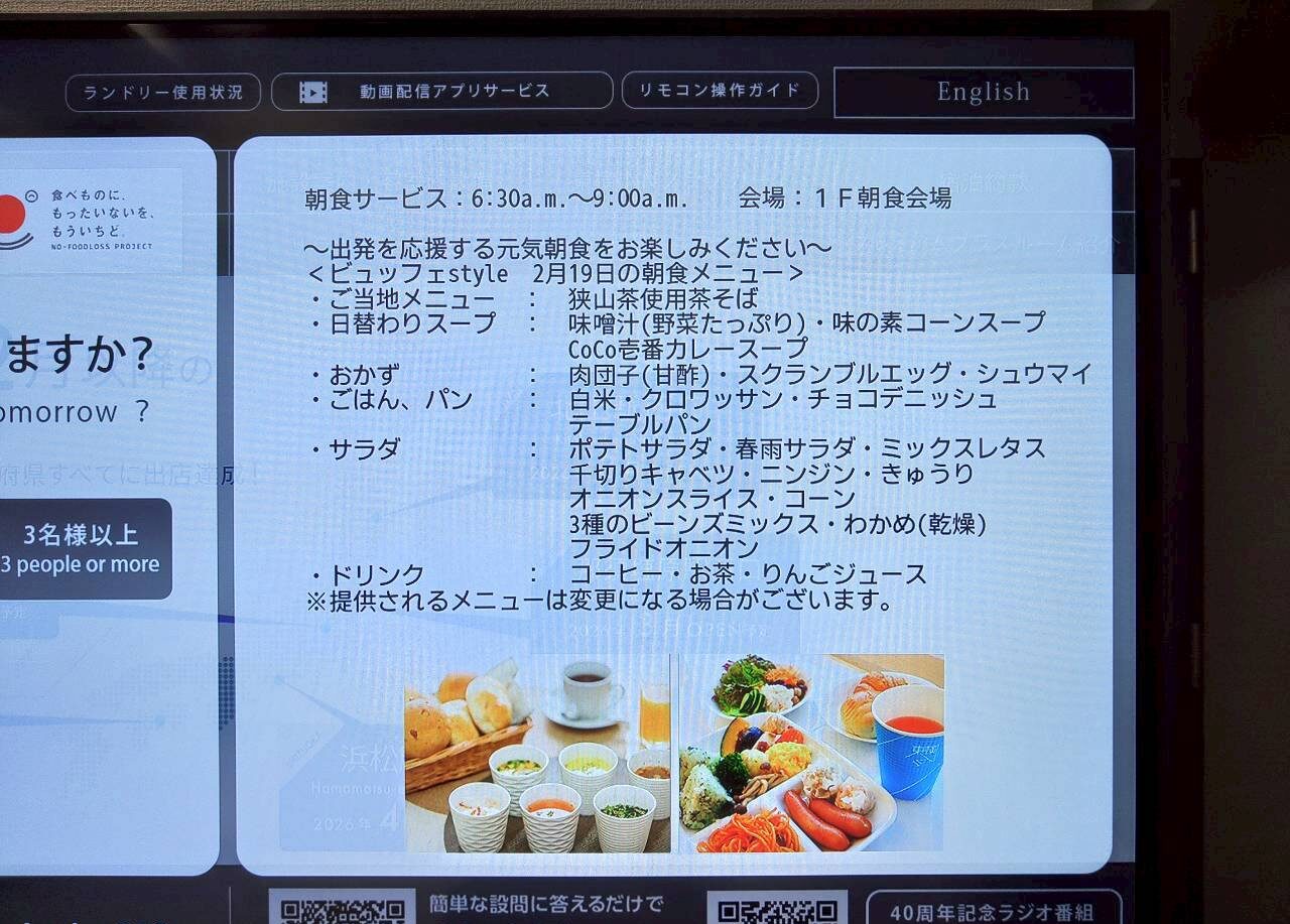朝食献立メニューは、前日にお部屋のテレビモニターで紹介されていました↓