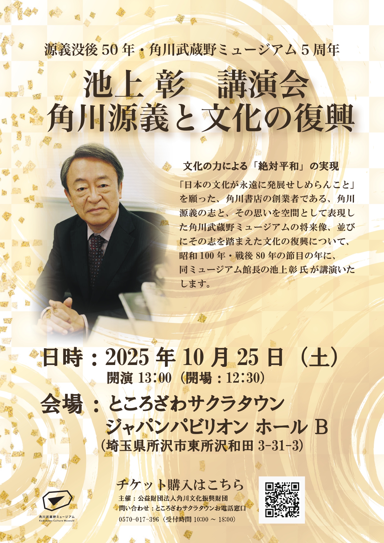 「日本の文化が永遠に発展せしめらんこと」を願った角川源義の志と、その思いを空間として表現した角川武蔵野ミュージアムの将来像ならびにその志を踏まえた文化の復興について、昭和100年・戦後80年の節目の年に、同ミュージアム館長の池上彰氏が講演します。