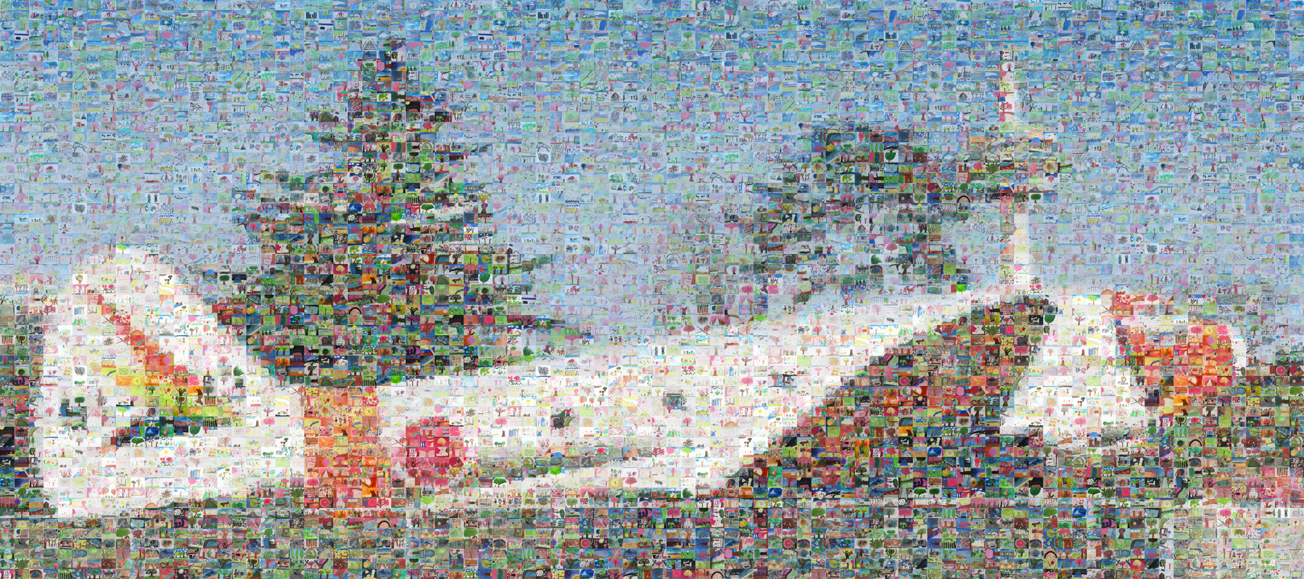 児童が描いた絵が大きな飛行機のモザイクアートになって登場!