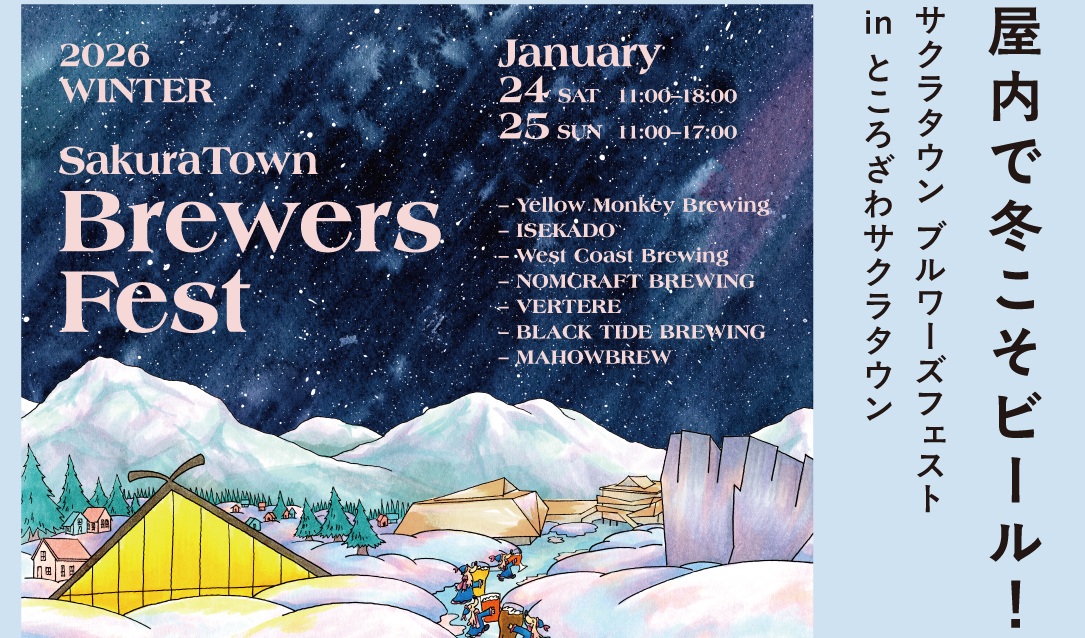 埼玉県所沢市 ところざわサクラタウンにて、2026年1月24日(土)・25日(日)の2日間、屋内型クラフトビールフェス「SakuraTown Brewers F...